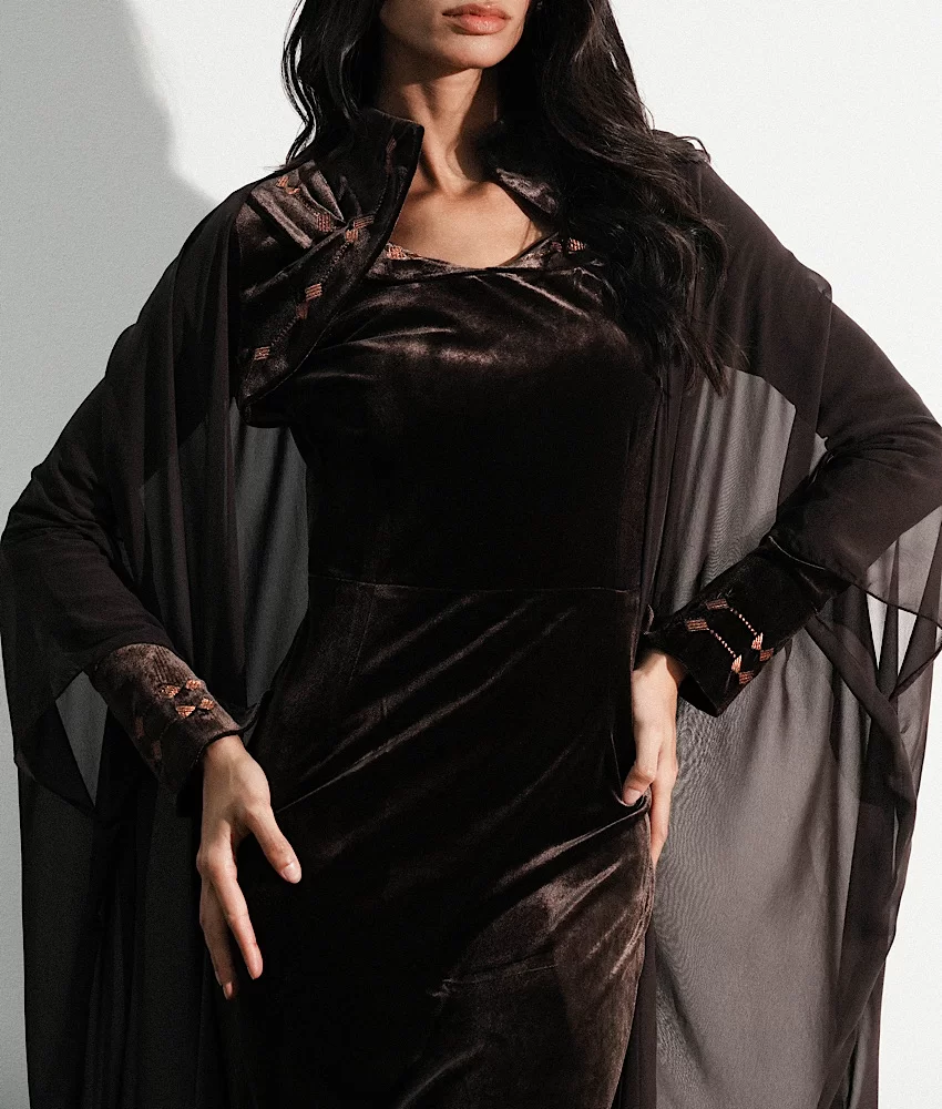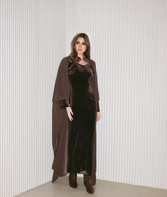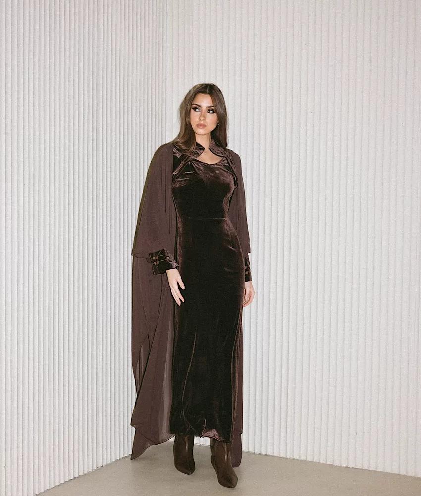 A brown velvet dress paired with a matching bisht, detailed with light brown embroidery.