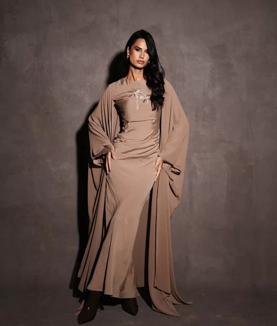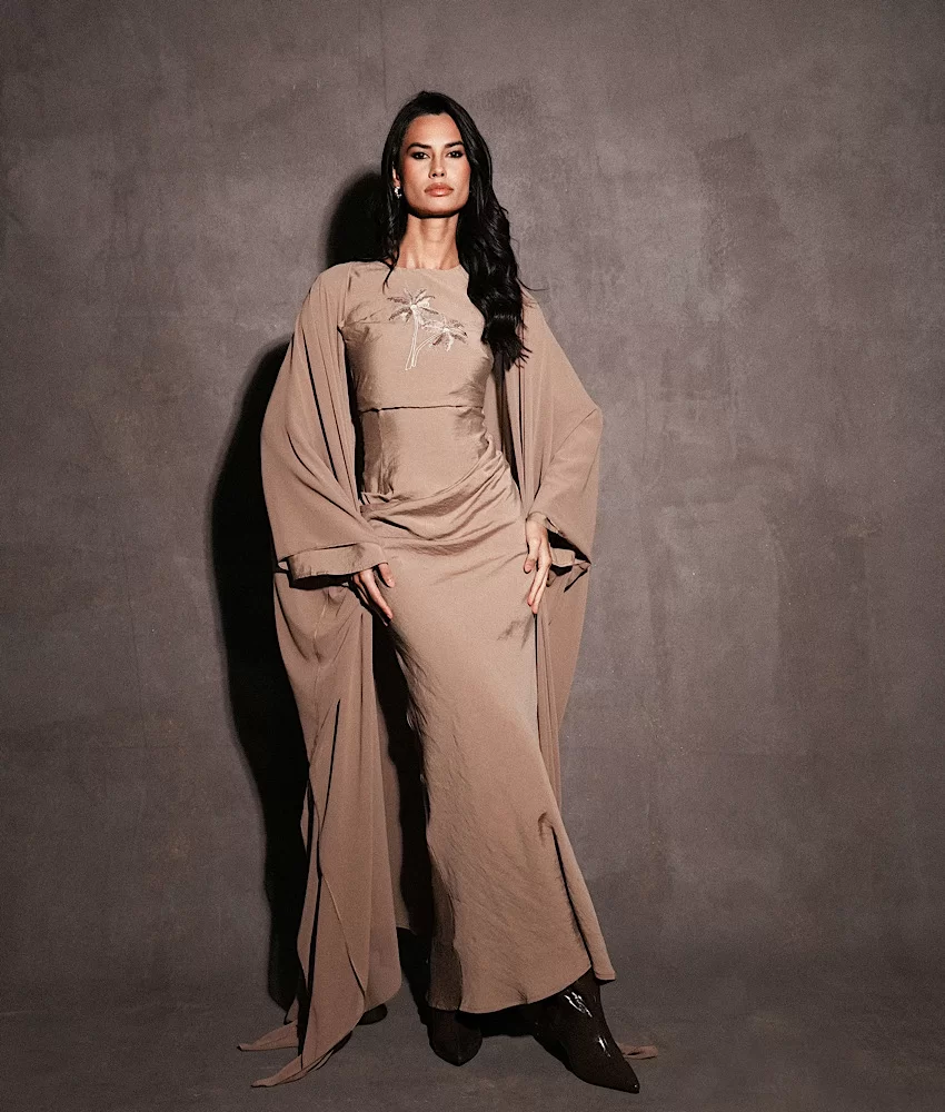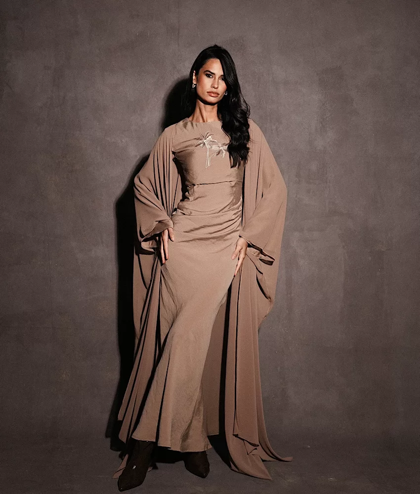A taupe dress with palm embroidery , paired with a flowy matching bisht for an elegant and refined look