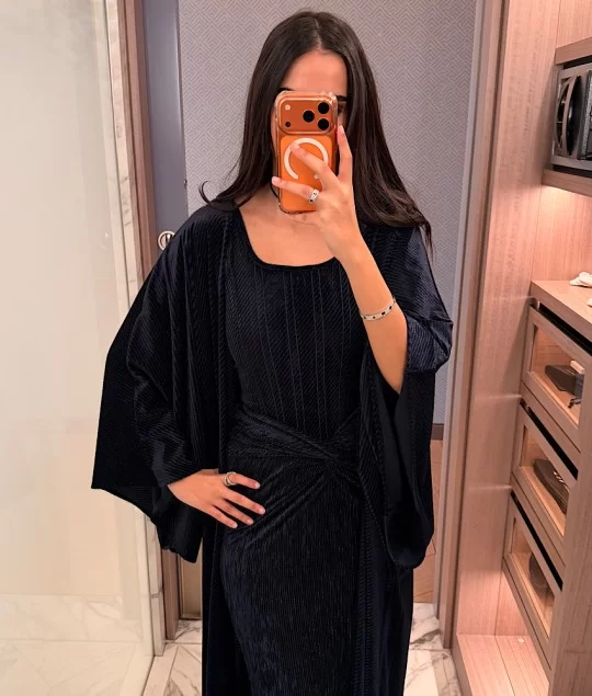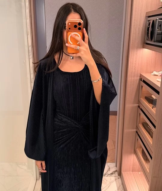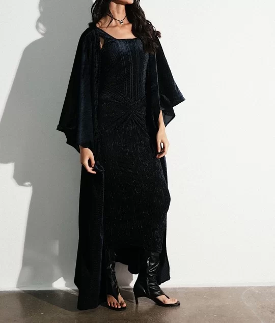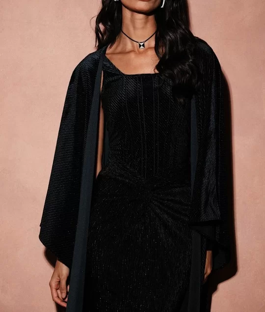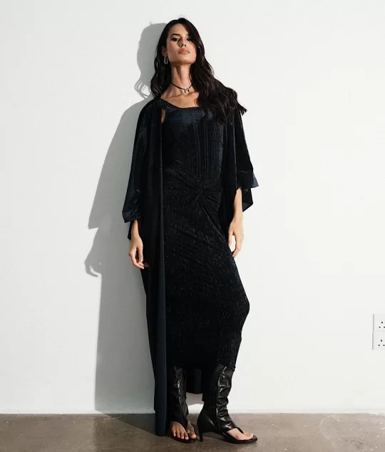 A shimmering corset top paired with a long matching bisht and a draped skirt.