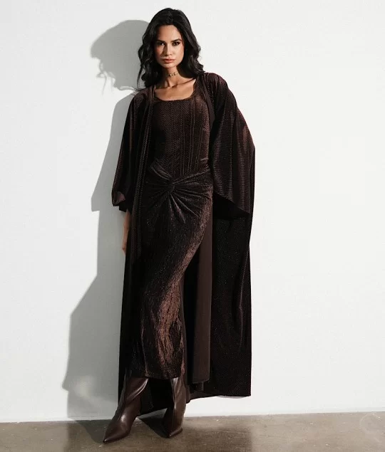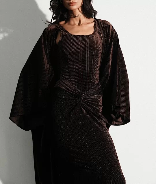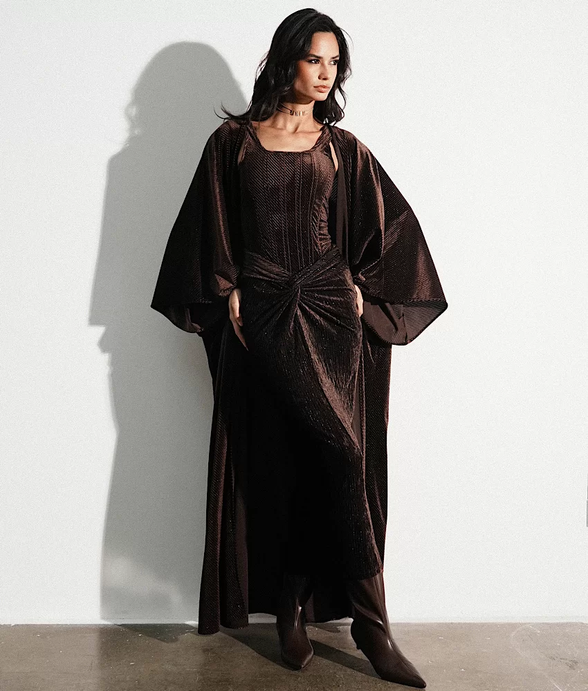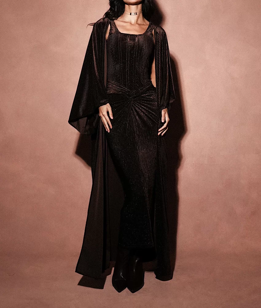 A shimmering corset top paired with a long matching bisht and a draped skirt.